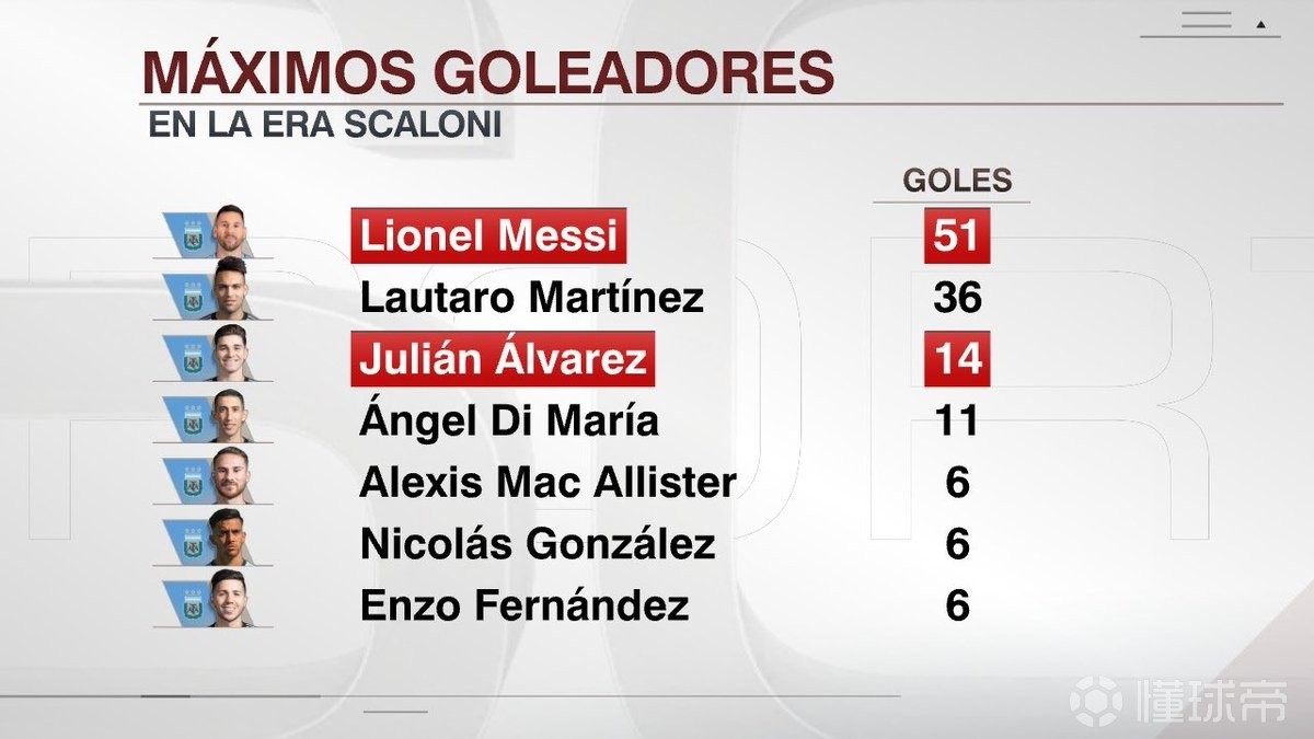 斯卡洛尼治下阿根廷队射手榜:梅西51球第一,小蜘蛛14球第三
